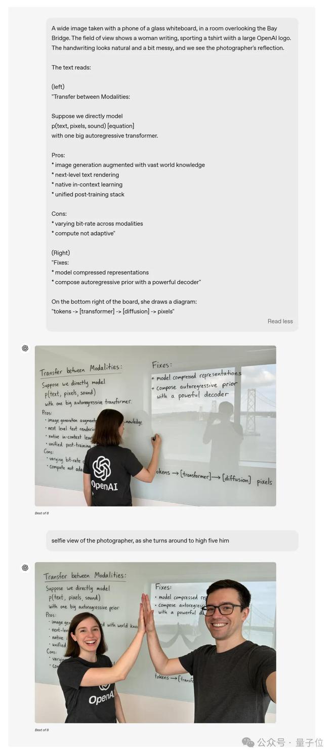 首先,OpenAI 表示 4o 现在能精确融合符号和图片了。