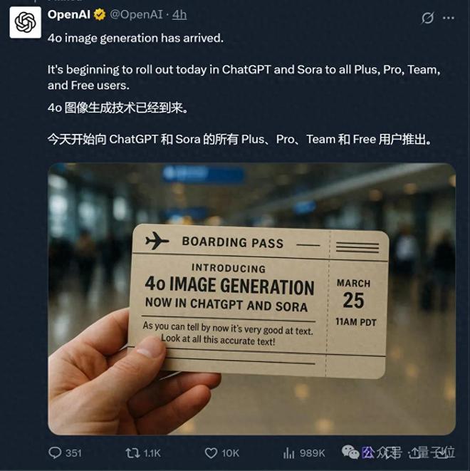 OpenAI 全量开放 GPT-4o 图像生成能力,这回免费用户第一时间上车!即日起在 ChatGPT 和 Sora 中,向所有 Plus、Pro、Team 和免费用户推出。