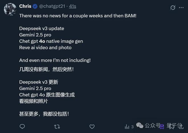 值得一提的是,昨晚 11 点(北京时间)OpenAI 突然宣布将有小发布,而 DeepSeek 刚刚发布了 DeepSeek-v3-0324 的官方技术报告。