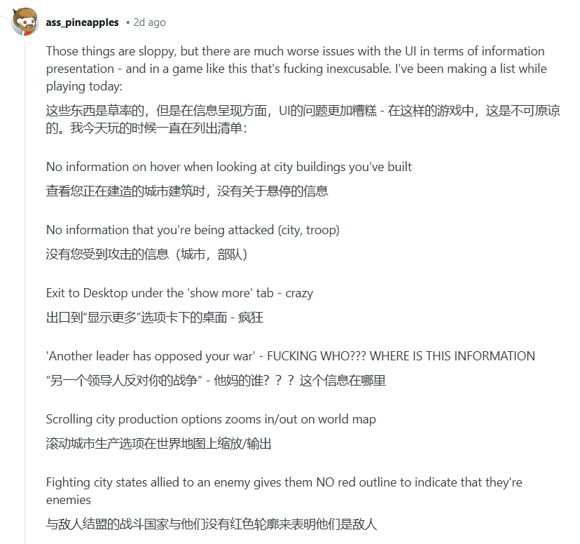 比如根据玩家反馈,目前《文明7》的 UI 设计存在大量的问题。美观问题带来的影响还在其次,但是作为一个资源管理和地图操作为主要玩法的游戏,《文明7》的上线版本有大量的文字和标识指示不清的问题出现,直接影响游戏体验。比如玩家没法快速掌握自己城邦的概况,或是比如用多个步骤完成一些并不复杂但高频的操作,甚至在系统提示“有其它领袖向你宣战”的时候,玩家都无法知道具体了解宣战的势力来自哪方。这都让首发玩家头疼不已。