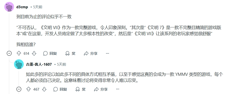 而还有玩家光是在阅读评测时就能发现,各家游戏媒体评测记者虽然吹捧的“彩虹屁”居多,但话术之间甚至都出现了打架——有媒体说游戏“做出了太多根本性的改变”,有媒体说“系列老玩家玩起来十分亲切”,有人说“十分完整”,有人说“十分精简”。玩家发出的灵魂一问获得数百条点赞:我们到底该听谁的?