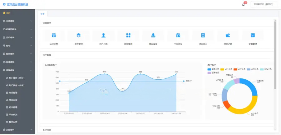| 财务模块: | 详细的资金流水、充值记录、提现记录,可多条件筛选,可配置提现参数等 |