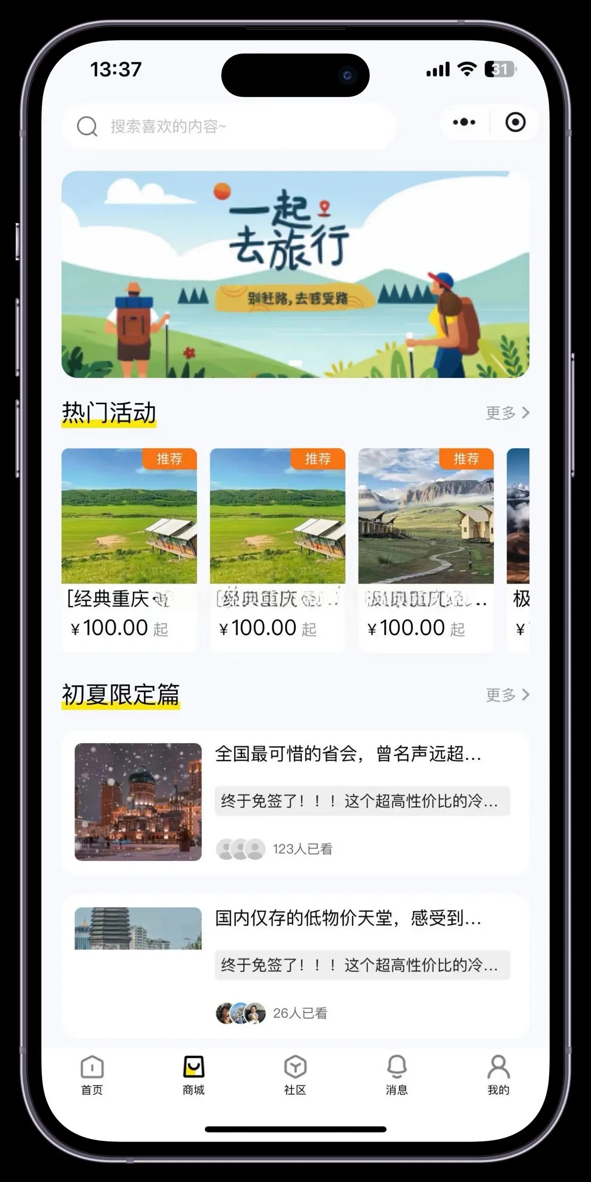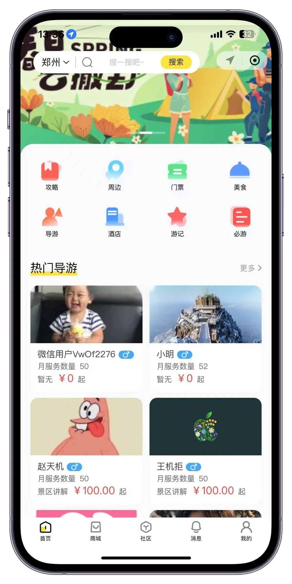 功能:旅游攻略,旅游游记,旅游门票预定,门票特价团购,酒店预定,旅游美食推荐,旅游商城,社区圈子,优惠券核销 导游入驻
